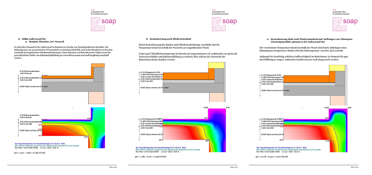 In der Simulation wurde nun die einfachste Maßnahme, der originalgetreue Neuaufbau des Flachdaches nach Mindeststandard berechnet und führte zunächst zu einer kritischen Verschlechterung. Durch die nun einseitge Erhöhung des Wärmeschutzes am Dach traten nun die punktuellen Wärmebrücken an Attika, Außenwand und Fenster, daß hier streckenweise Grenz- temperaturen von
